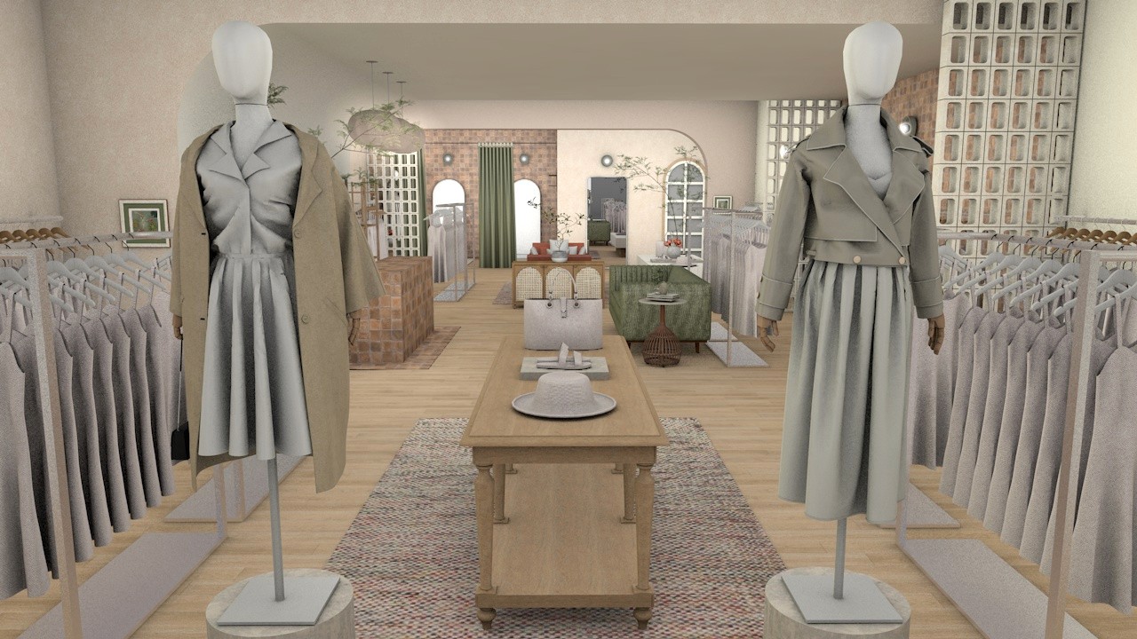 Central to the concept is a beautifully crafted 3D environment that balances the brand’s signature colour palette with a light, airy spatial quality. Soft, neutral backdrops are layered with warm tones, allowing the main brand colour to subtly anchor the space without overpowering it. A rich mix of textures—natural timbers, soft fabrics, brushed metals, and tactile finishes—adds depth and interest, creating a setting that feels both elevated and approachable. The result is an environment that feels calm, contemporary, and inherently wearable, much like the clothing itself.