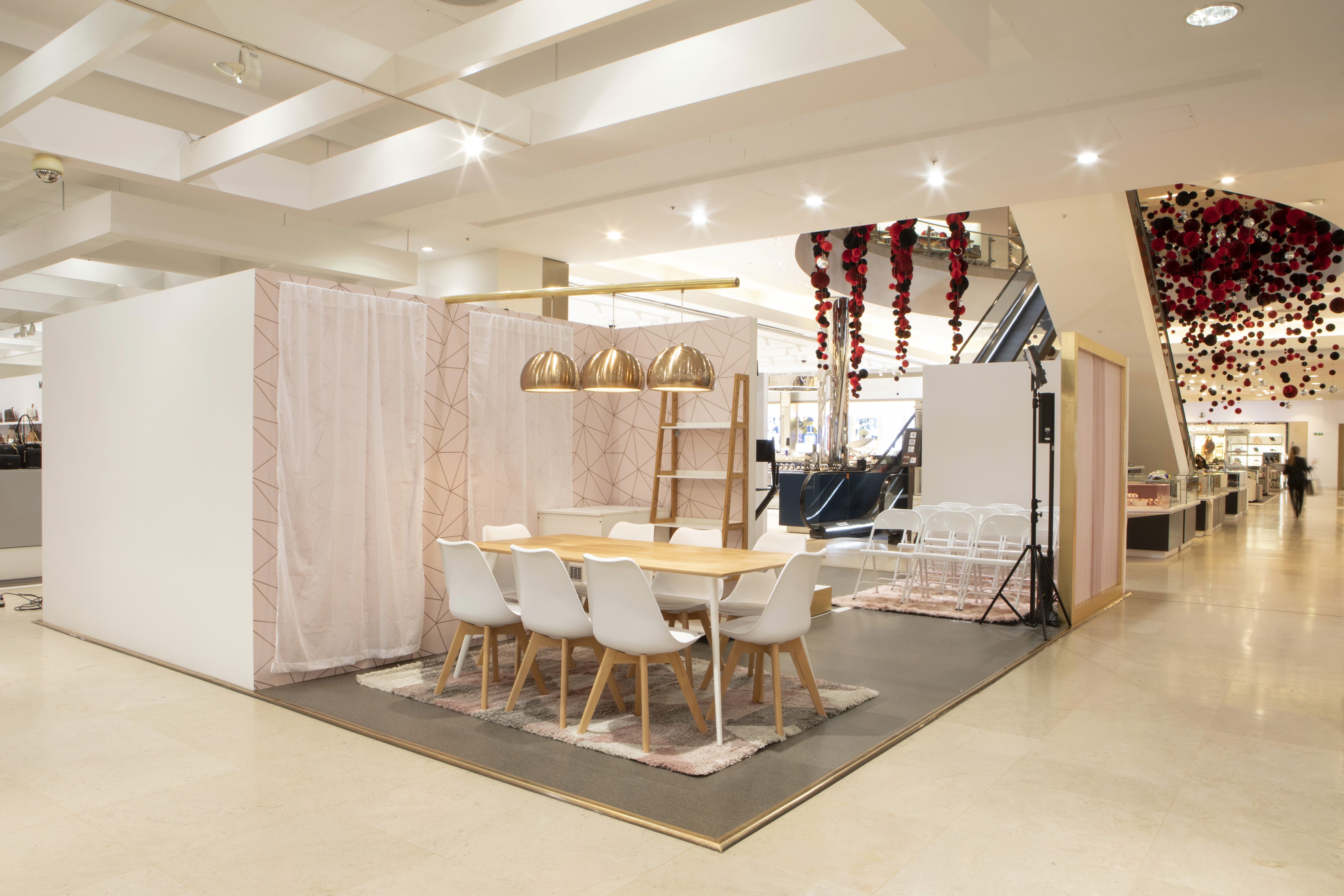 The visual language of the space was key to its success. A palette of pink tones defined the environment—cool, soft, and luminous—creating a dreamy yet contemporary atmosphere. Surfaces were treated to enhance light diffusion, giving the space a bright, flattering quality that naturally elevates content. The overall aesthetic struck a careful balance between inviting and exclusive: approachable enough to feel comfortable, yet refined enough to feel aspirational. The result was a space that not only celebrated the launch of the Beauty Hall, but also became a destination in its own right—designed to be seen, shared, and remembered.